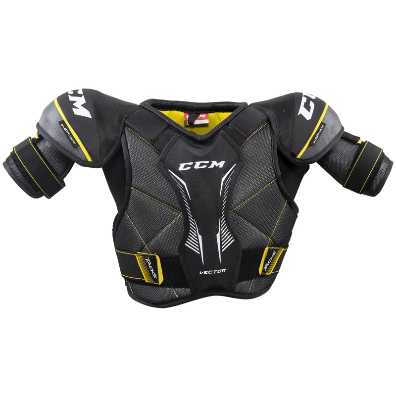 The CCM Tacks Vector Shoulder Pads feature a molded front base jacket with an anatomical construction for lightweight feel and good protection.